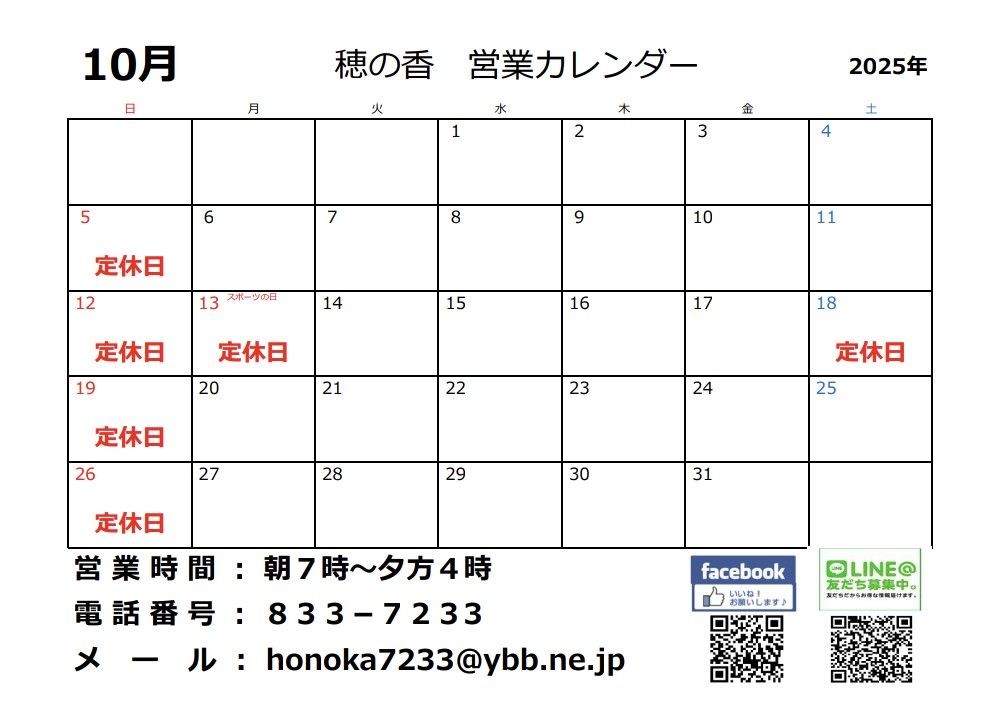 10月は各日曜日と、第3土曜18日(土)が定休日となり、13(月)はスポーツの日でお休みをいただきます。