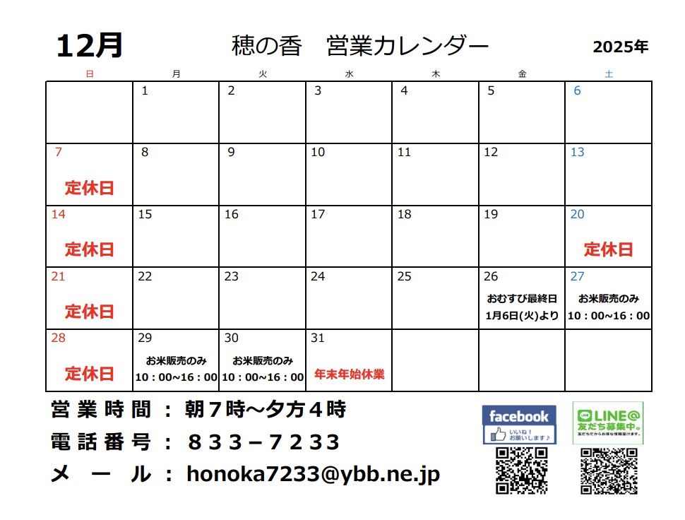 12月は各日曜日と、第3土曜20日(土)が定休日となり、31日(水)から年末年始休業でお休みをいただきます。また、27日(土)からおむすびはお休みになります。