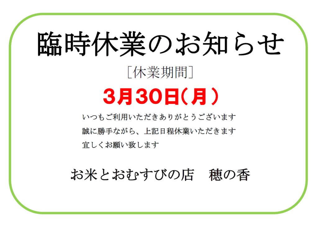大変急ではございますが、明後日3/30(月)はお休みをいただきます。