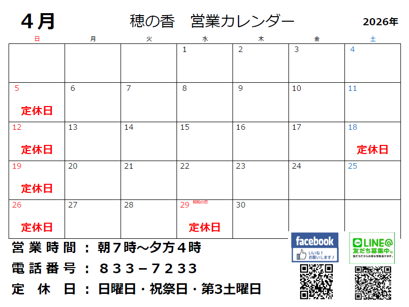 4月営業案内 2026年4月6日 最終更新日時 : 2026年4月6日 高良大地 4月は各日曜日と、第3土曜18日(土)が定休日となり、29日(水)は昭和の日でお休みをいただきます。 いよいよ新年度も本格始動して店舗周辺も活気がでてきました。シッカリご飯を食べてスタートダッシュ決めましょう(^^)